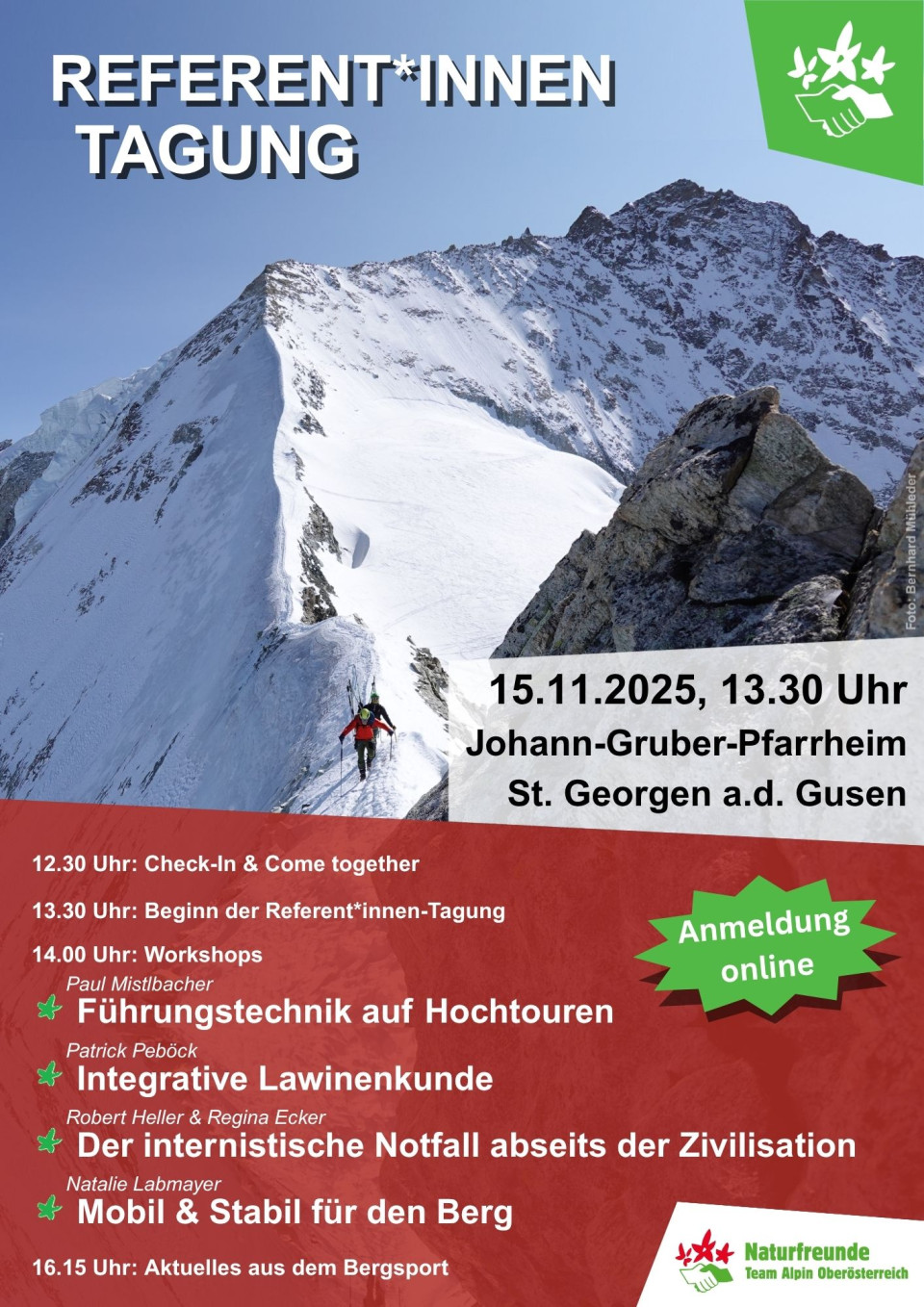 Die Arbeitsgemeinschaft Team Alpin der Naturfreunde Oberösterreich lädt alle Referent*innen, Übungsleiter*innen und Instruktor*innen der Bereiche Bergsteigen, (Berg-)Wandern (inkl. (Berg-)Wanderführer*innen), Hochtouren, Schneeschuhwandern, Skitouren, Skihochtouren und die Mitglieder der Alpinistengilde OÖ zur Referent*innen-Tagung und zum traditionellen Bergsteiger*innen-Treffen in St. Georgen a.d. Gusen ein.
